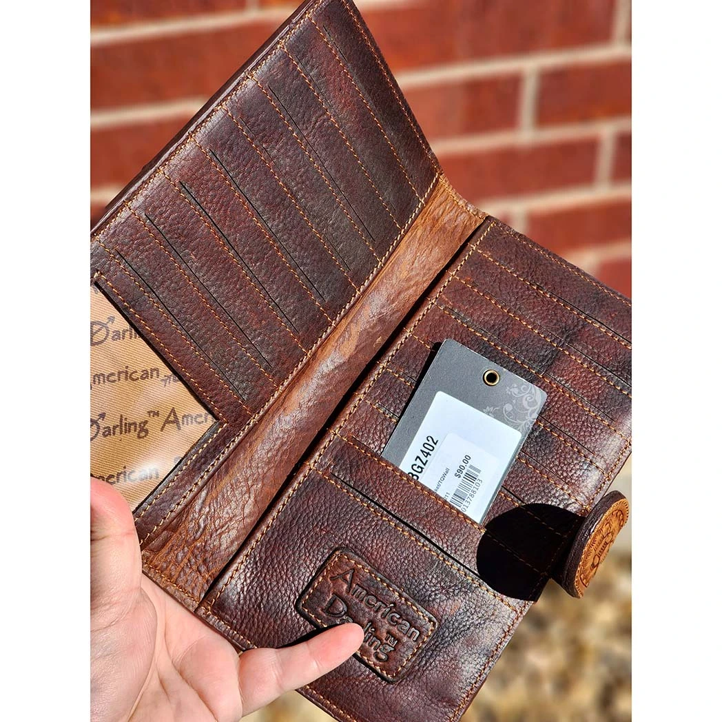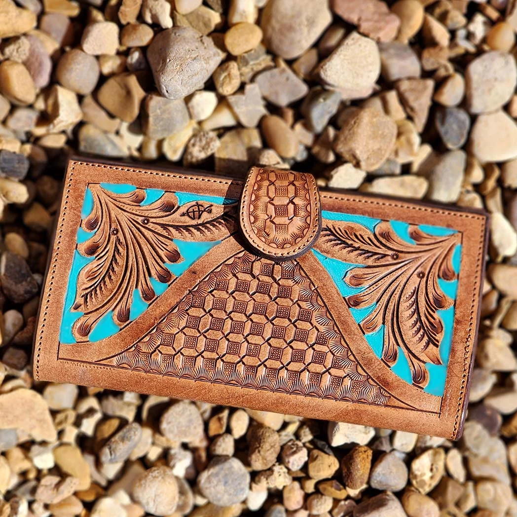 This stunning Tooled leather wallet has a turquoise accent that just makes this whole wallet pop! Plenty of places for your credit cards and more.