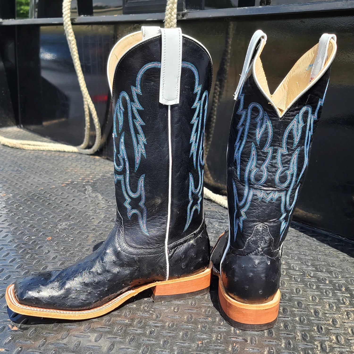 These are a classic pair of black Anderson Bean ostrich boots. The blue and white stitching really stands out on these good looking boots.