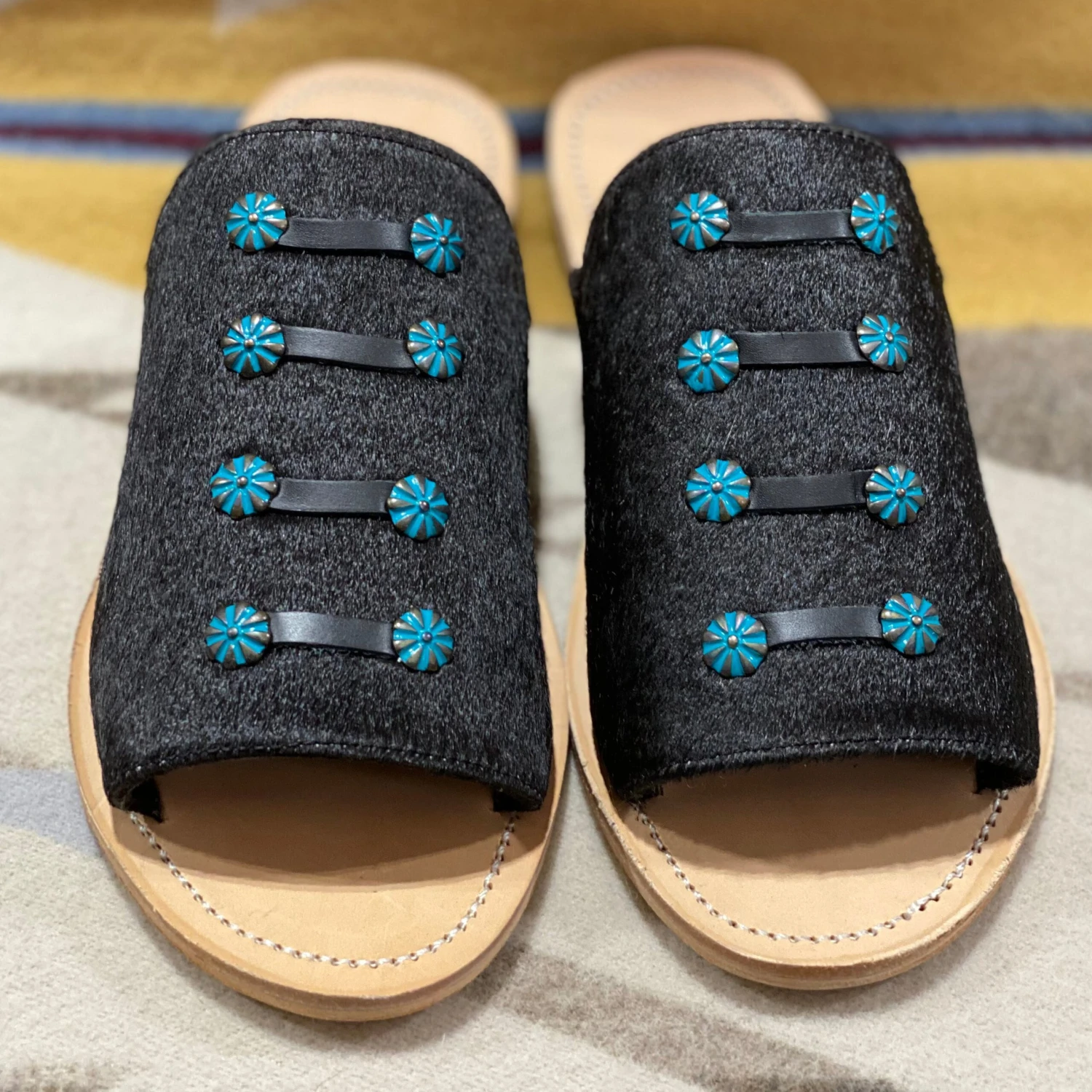 These black cowhide sandals are accented with turquoise studs to make these sandalsĀ stunning and unique. Perfect this summer to accentuate an outfit.Ā