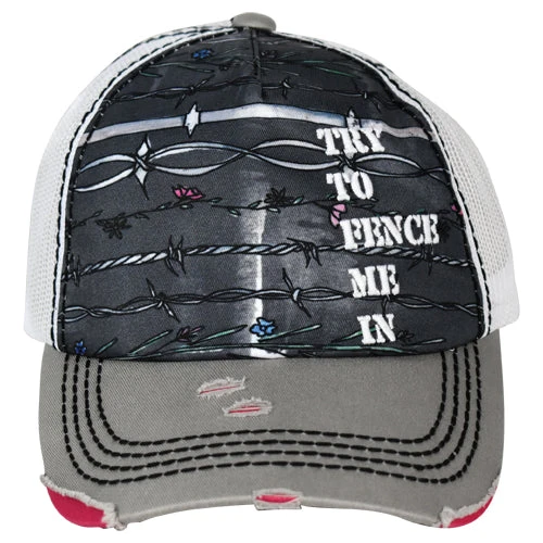 CATCHFLY BASEBALL CAP, GREY & BLACK WITH “TRY TO FENCE ME IN” & TYPES OF BARB WIRE, HIDDEN PONYTAIL SEAM, DISTRESSED EDGES & VELCRO BACK