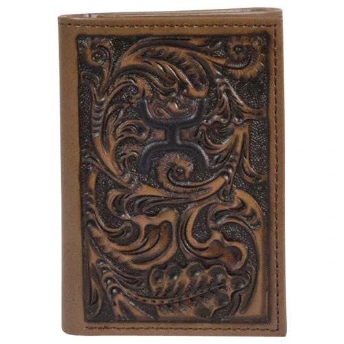 This trifold wallet features a Hooey guy in the middle of tooled accents. The inside has three open slit pockets, six credit card slots, and one license window.