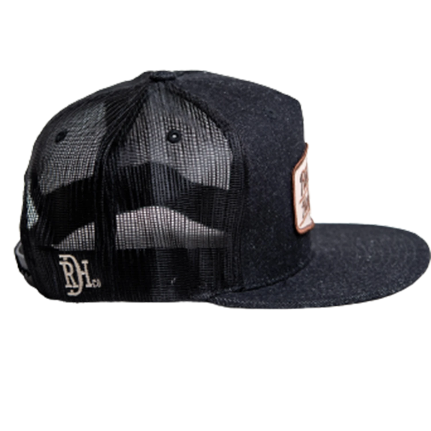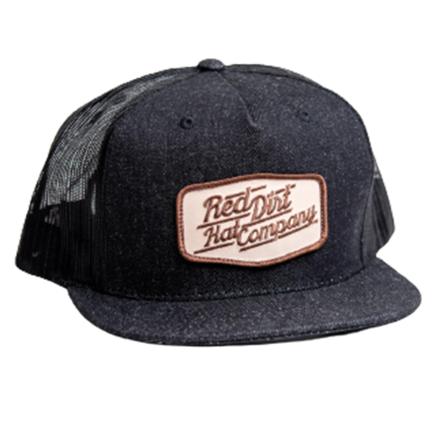 This Red Dirt Cap is Black denim/black mesh has 6 panel snapback style & features the new “Rebel” patch.